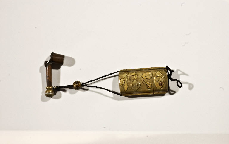 L'ojime ha forma sferica, decorato con foglie incise in basso rilievo.