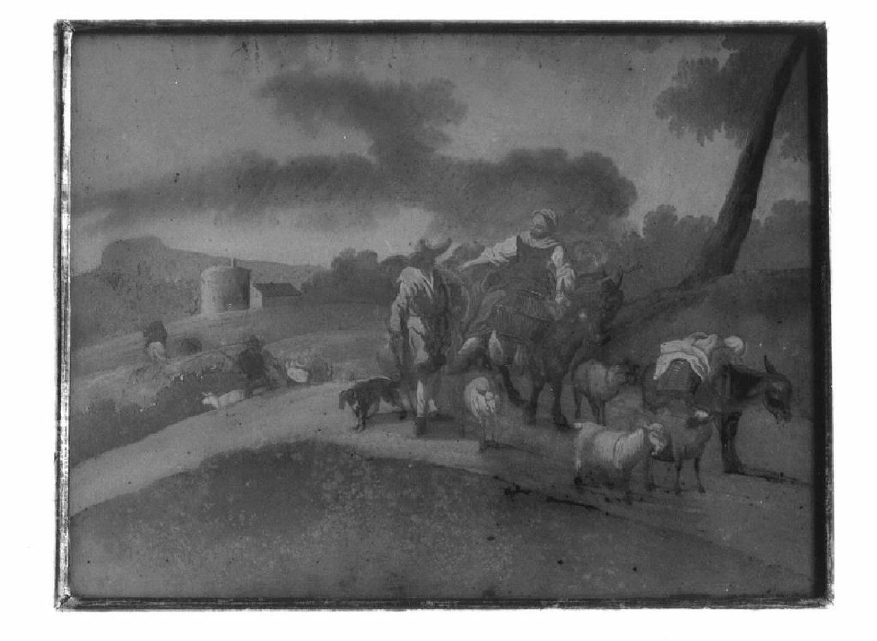 paesaggio con pastorella e contadino su un sentiero