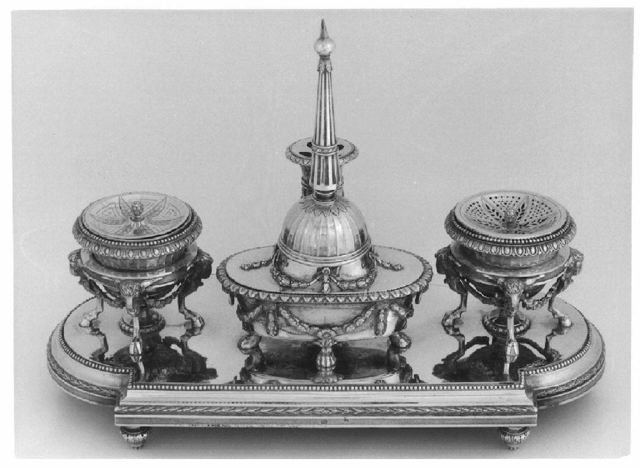 Base rettangolare con lati corti semicircolari, profili gradinati decorati a foglie e perlinati, quattro sostegni a ghianda decorata; contenitori sostenuti da quattro zampe terminanti a zoccolo e con attaccatura a testa caprina, ghirlande di congiunzione tra i sostegni, fascia superiore dei contenitori profilata a ovuli e perlinata, contenitore centrale ovale con zampe leonine e ghirlande, campanello a cupola con alto puntale scanalato poggiante su scatola per sigilli a forma di urna, contenitore per inchiostro con coperchio decorato e indipendente, contenitore per la sabbia con coperchio traforato, portapenne ad urna allungata con decori a palmette e ghirlande