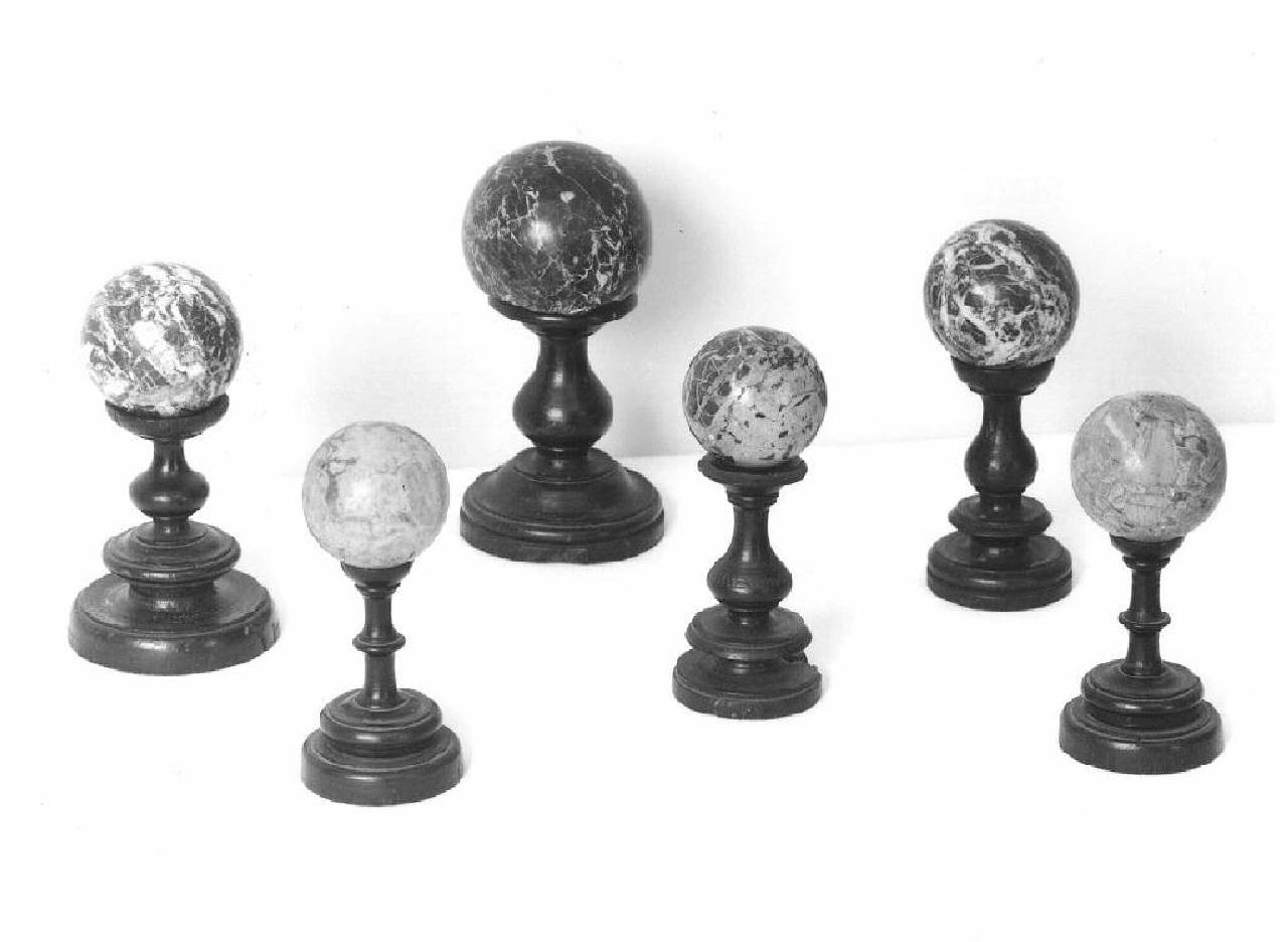 La sfera di marmo poggia su un supporto ligneo a balaustro con base circolare gradinata