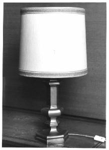 Fusto in peltro a sezione esagonale a balaustro, paralume cilindrico in stoffa beige con profili di fettuccia verdina