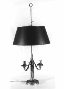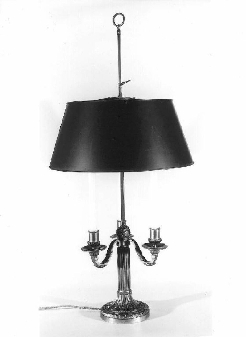 Fusto a colonna scanalata, base circolare con profilo a treccia, tre bracci a voluta decorate a fogliami con piattino profilato a perle, paralume in metallo