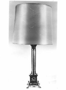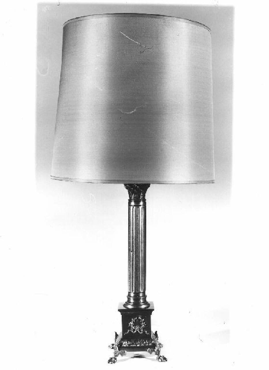 Fusto a colonna scanalata con capitello fogliato, piedestallo cubico centrato da corona d'alloro, profilo inferiore decorato a fogliame, quatto piedini a zampa ferina
