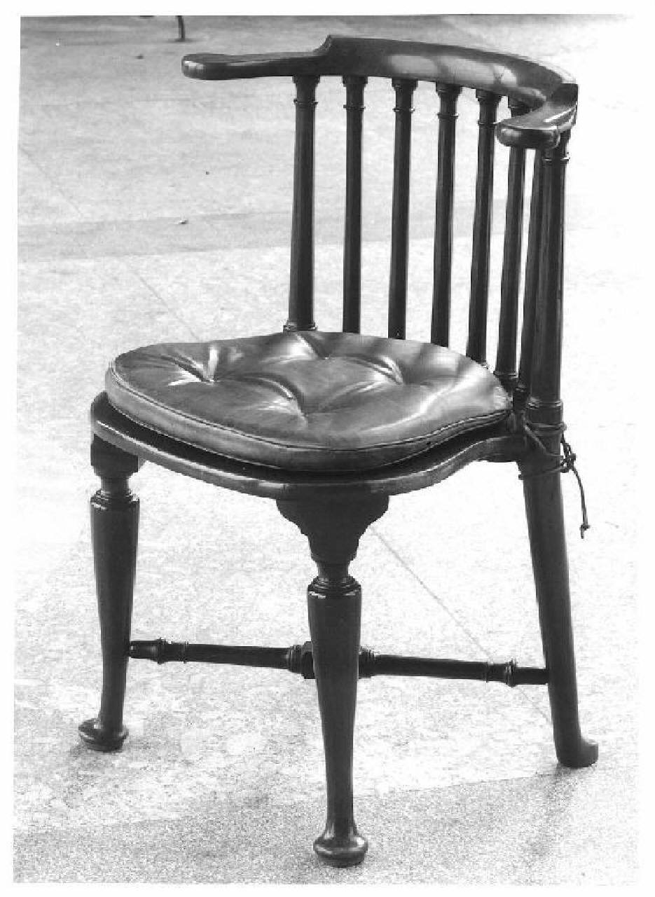 Schienale ricurvo con nove colonnine, gambe a balaustro con traversine incrociate a balaustro
