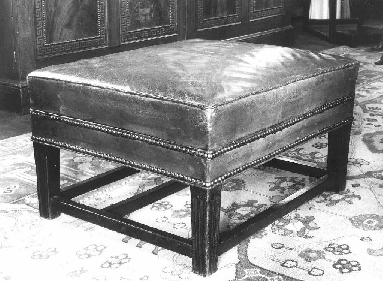 Corpo rettangolare foderato in pelle rossa con borchie, gambe rastremate scanalate, traverse lisce