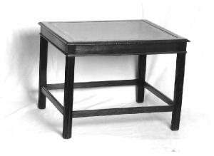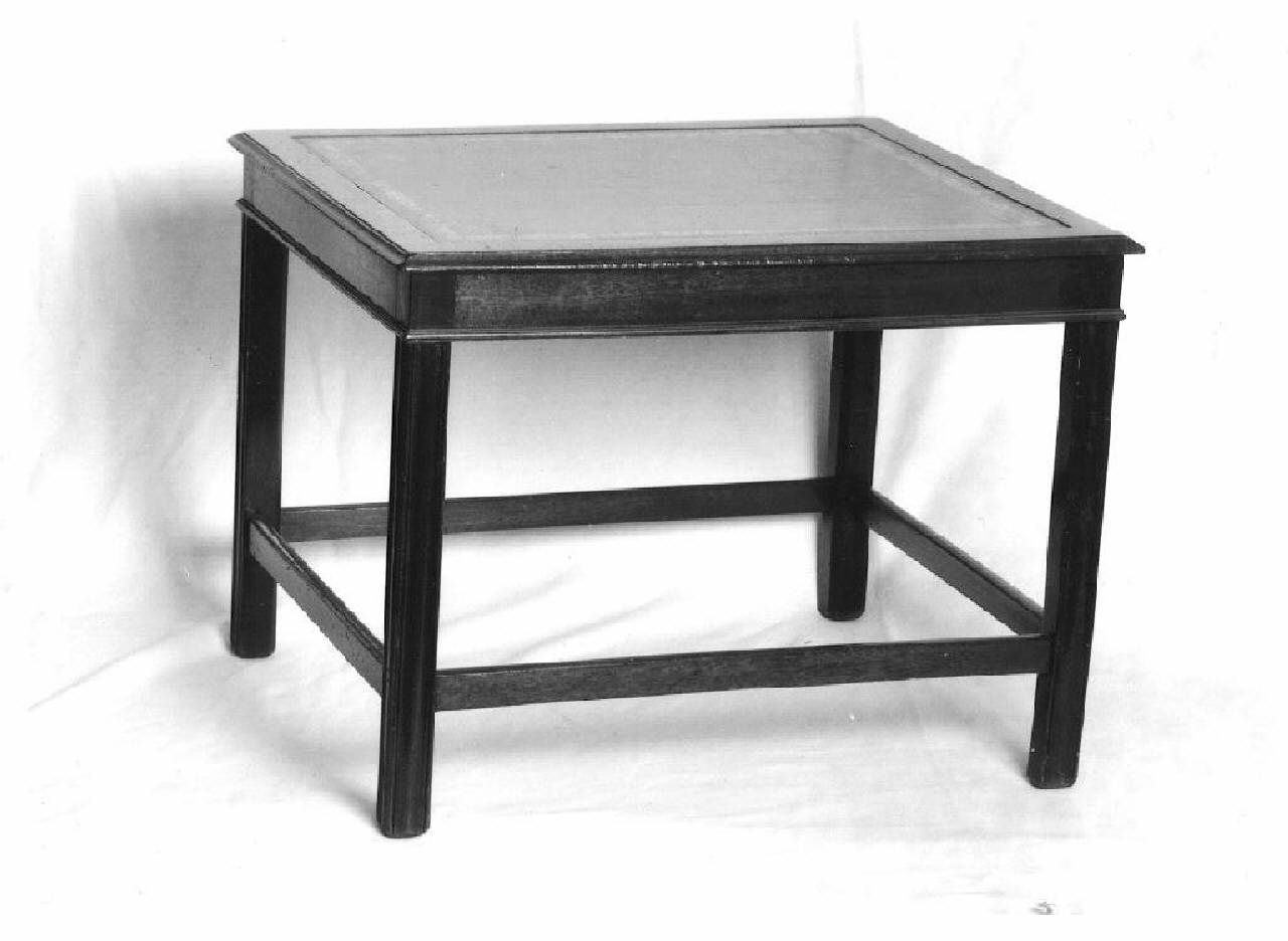 Piano rettangolare rivestito in pelle verde, gambe a pilastrino scanalato con traverse lisce