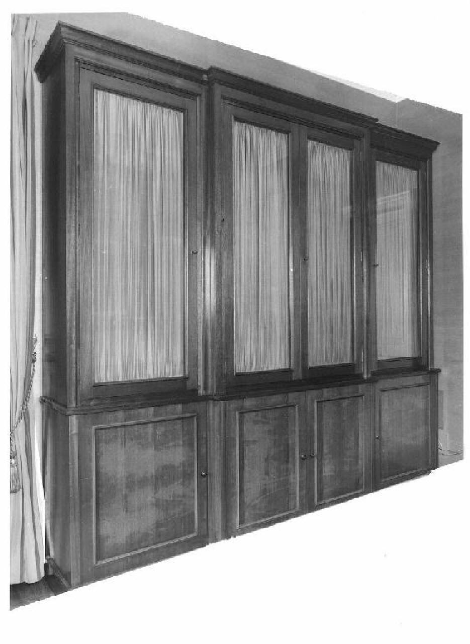 Fronte a quattro ante tripartita con parte centrale leggermente aggettante, corpo inferiore in legno con pannelli riquadrati e superiore in vetro