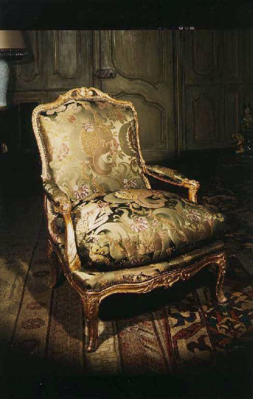 Poltrona rivestita in seta operata con fili d'oro moderna, braccioli imbottiti, struttura lignea dorata, sagomata, intagliata e centrata da motivo fiori e foglie, gambe e braccioli mossi, schienale arretrato, cuscino indipendente