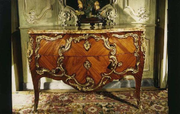 Cassettone con fronte a serpentina, ripiano in marmo, due cassetti lunghi senza traversa. Profilature parziali, scarpette, e maniglie a ricciolo in bronzo dorato, impiallacciatura a farfalla.