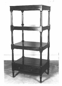 étagere a quattro ripiani, sostegni tubolari con piedi a balaustro, cassetto sotto il ripiano inferiore