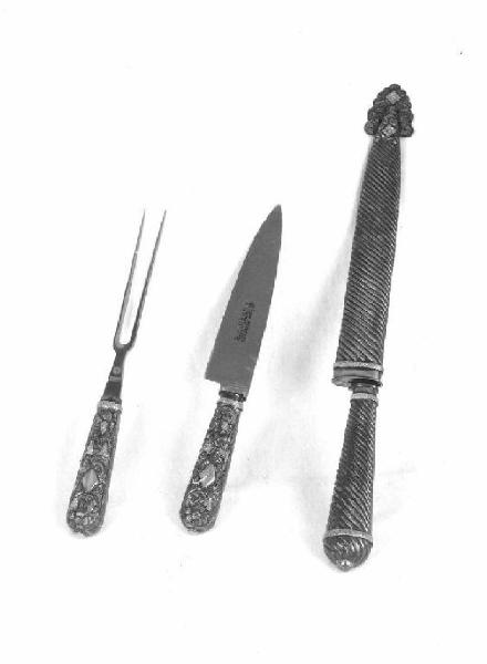 L'impugnatura è sbalzata e decorata con tre diversi metalli a motivi floreali e volute. I bordi dell'impugnatura sono a metallo liscio e due volute.\nDi fianco all'incisione dell'iscrizione è inciso anche la sagoma di un albero.