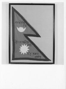 La bandiera rossa è come composta da due triangoli inseriti uno nell'altro. Tutto il perimetro della bandiera è percorso da una fascia di tessuto blu. All'interno in tessuto bianco un sole e una luna incrociata al sole. La bandiera è inserita all'inteno di una cornice e di un vetro.
