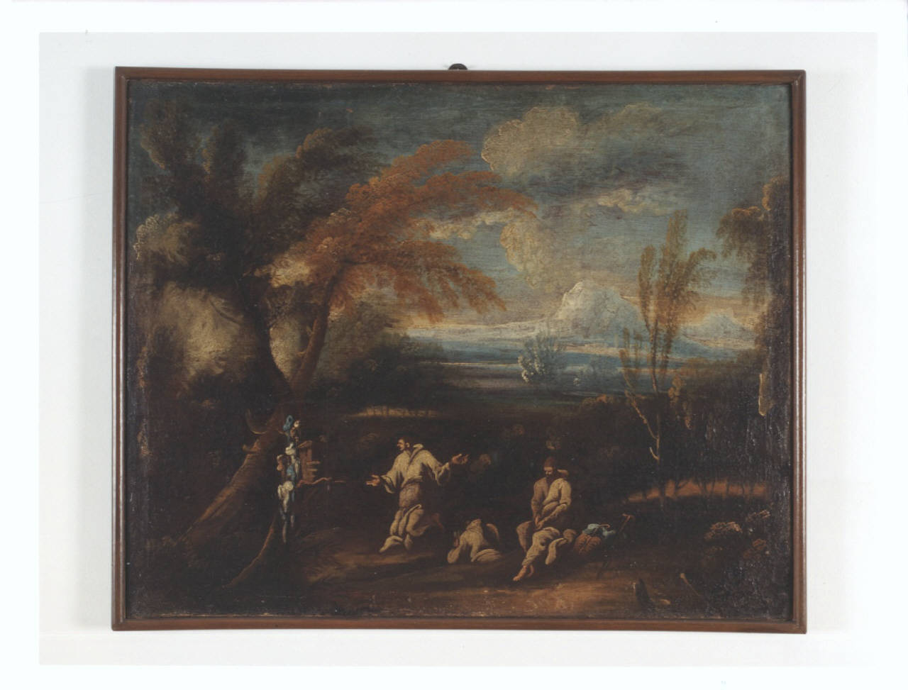 - NOTIZIE STORICO CRITICHE Il dipinto, già nella collezione delle sorelle Gigina e Nedda Necchi, entra a far parte del patrimonio FAI nel 2001, in quanto parte del lascito di Villa Necchi Campiglio a Milano. Attribuito a un seguace di Alessandro Magnasco (vedi Inventario Trinity Fine Art), l'opera è un esempio della nuova pittura di genere introdotta dall'artista genovese e caratterizzata da vasti paesaggi di fantasia con scene di vita popolaresca, entro cui si stagliano piccole figure di monaci, mercenari, mendicanti. L'autore mostra la conoscenza di Magnasco nel colore livido e nei contrasti luministici, qui resi dalla gamma cromatica bruna del paesaggio a cui si contrappone il cielo terso e le piccole figure che rischiarano la scena. Le figure maschili, identificate come frati, potrebbero essere anche più genericamente figure di viandanti, come sembra suggerire il bastone da pellegrino posto accanto alla cesta.
