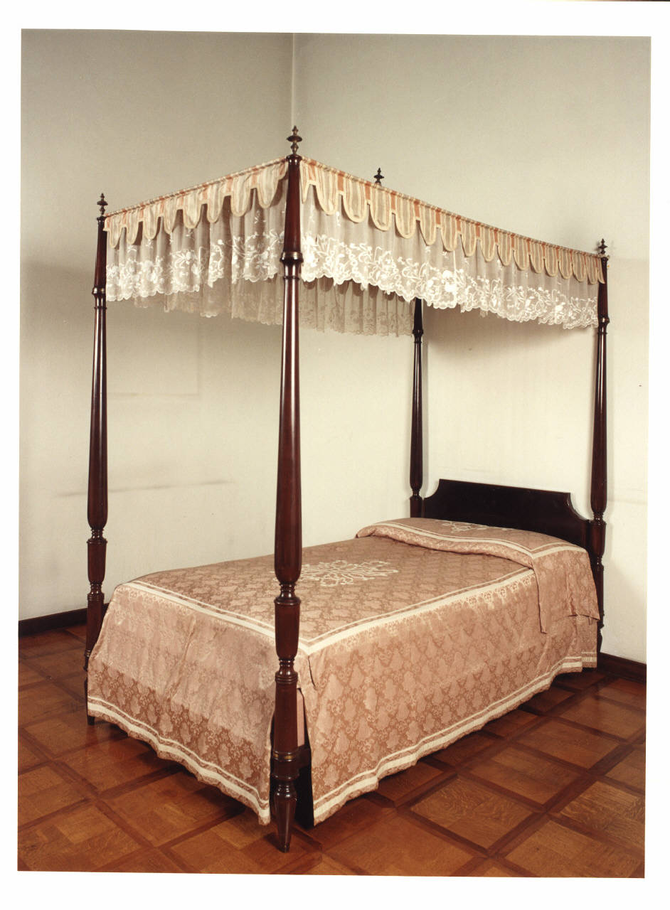 Letto in legno con baldacchino formato da quattro sostegni torniti che sorreggono un tessuto di seta rosa, a righe, dal quale scende un drappo di pizzo ricamato a punto pieno con fiori e foglie. Sul letto elegante tessuto in seta damascata con ricamo centrale.