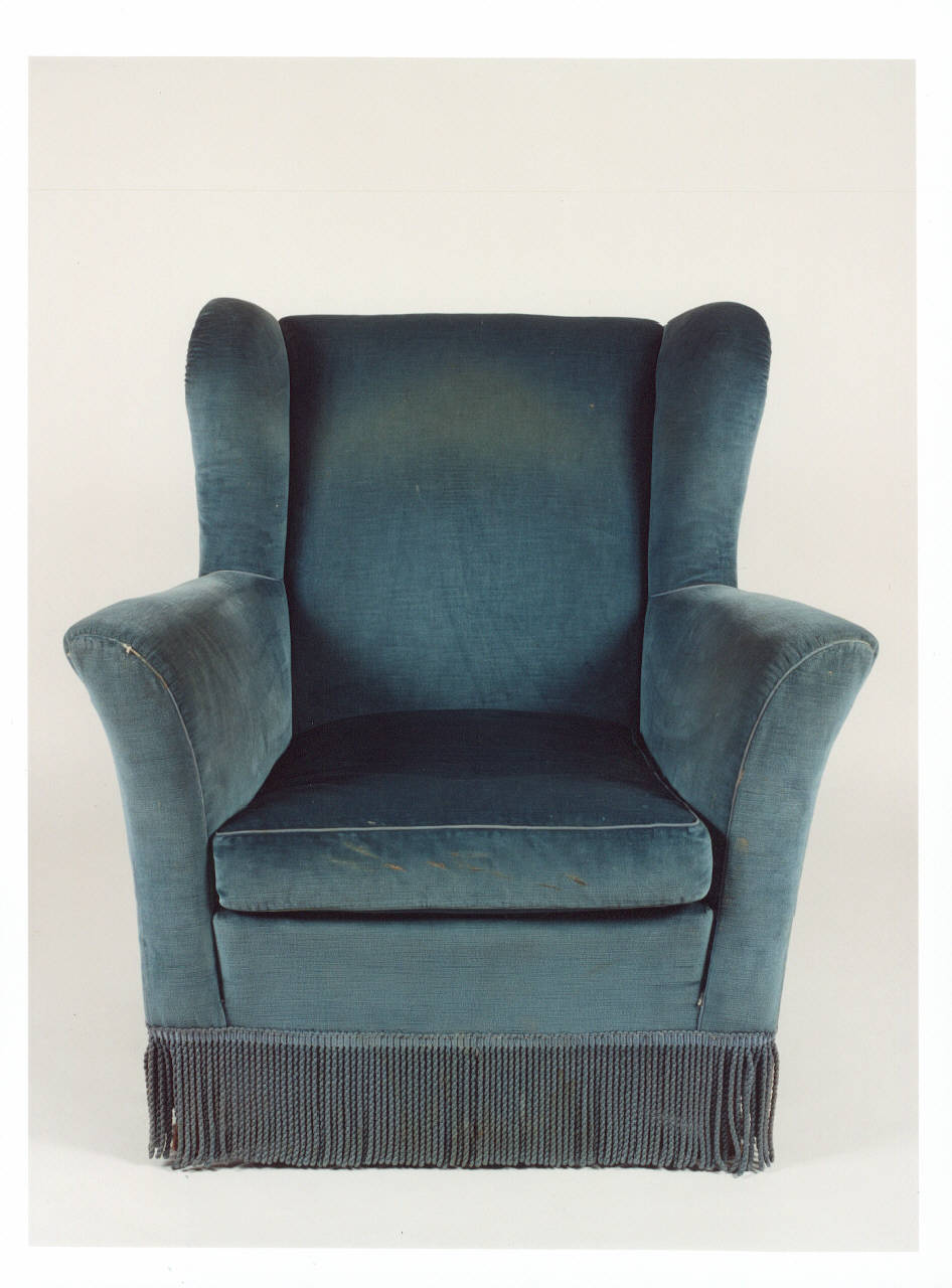 Poltrona rivestita in velluto blu con frange finali. Ricorda le bergere, cioè la poltrona che presenta fianchi e braccioli imbottiti.