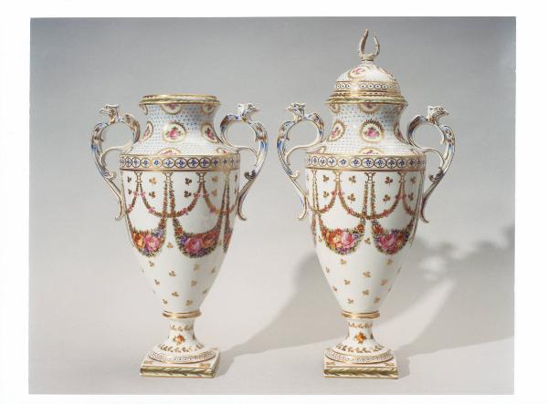 Coppia di vasi, di cui uno senza coperchio, appartenenti alla Manifattura di Sèvres; decoro a ghirlanda, floreale e dorature.