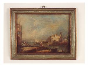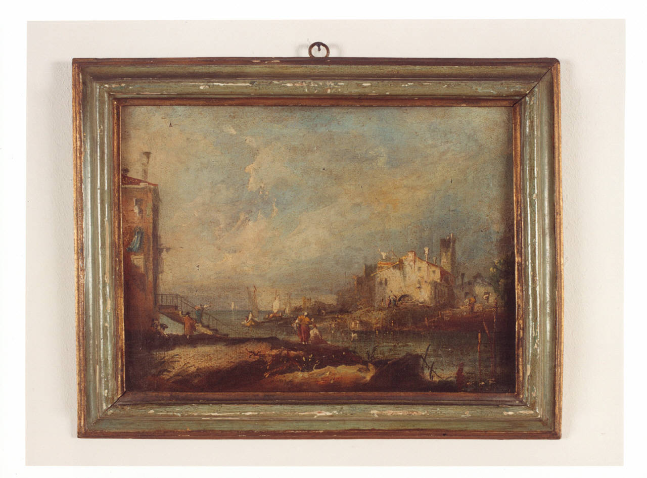 - NOTIZIE STORICO CRITICHE Il dipinto, già nella collezione delle sorelle Gigina e Nedda Necchi, entra a far parte del patrimonio FAI nel 2001, in quanto parte del lascito di Villa Necchi Campiglio a Milano. Tra i dipinti donati si evince un particolare interesse collezionistico di Gigina e Nedda per la pittura di paesaggio, di cui quest'opera costituisce un esemplare. In particolare, la veduta rappresentata in questo dipinto, resa attraverso rapidi e veloci colpi di colore, è riferibile alla mano di Giacomo Guardi, pittore veneziano e continuatore della bottega di Francesco, padre e noto vedutista. I suoi dipinti si caratterizzano per una luce solare, anche se sempre velata, che cade su paesaggio e figure, particolare come l'atmosfera che avvolge la città di Venezia, soggetto ricorrente nelle opere sia del padre che del figlio.