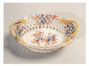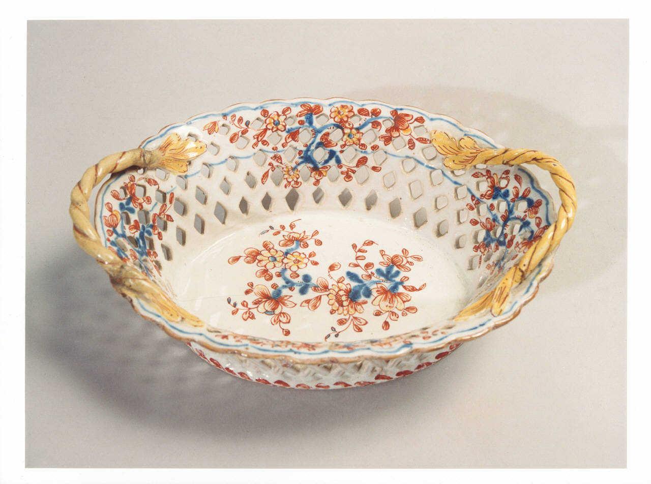 Cestino traforato con bordo superiore ondulato, piccoli manici a torciglione, profilatura in blu, decoro floreale.