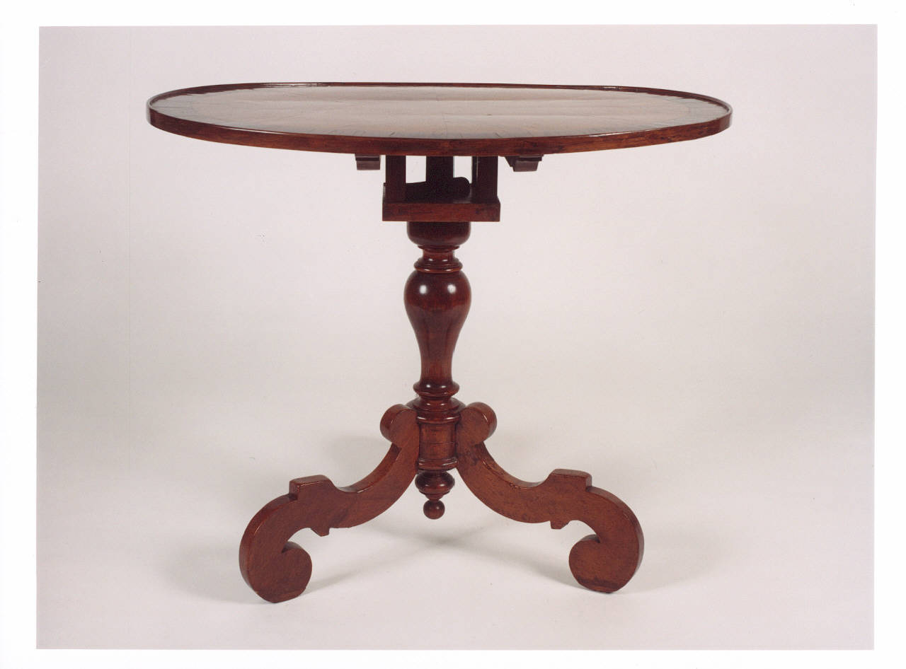 Pregevole tavolo rotondo in legno impiallacciato con fusto a forma di vaso e tre sostegni a volute.