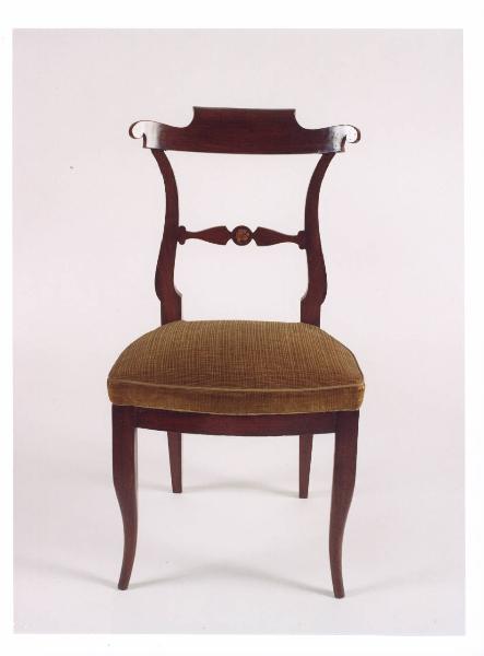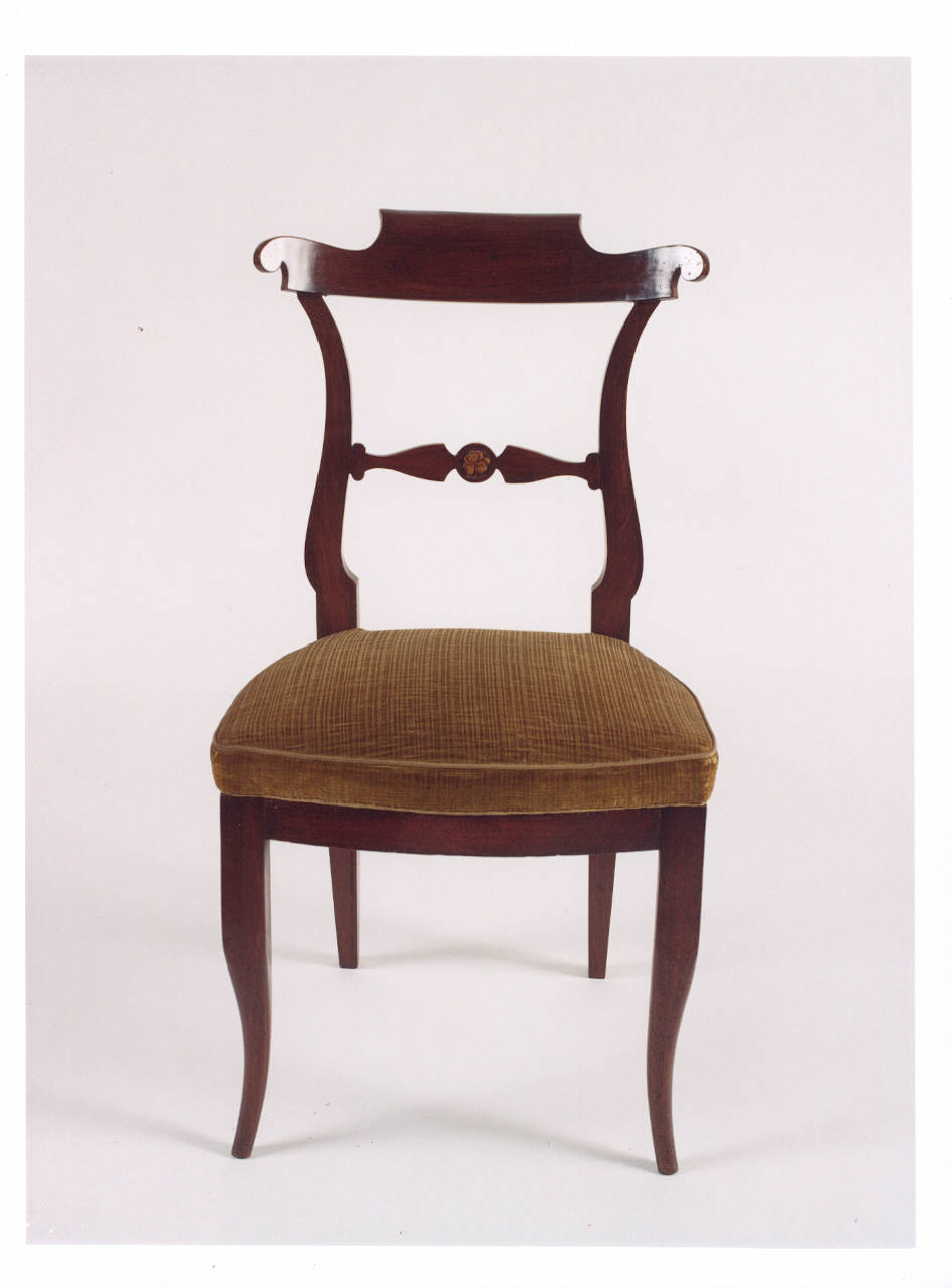 Sedia neoclassica con schienale a lira e decoro in bronzo dorato a forma di fiore nella parte centrale di raccordo tra le due anse.