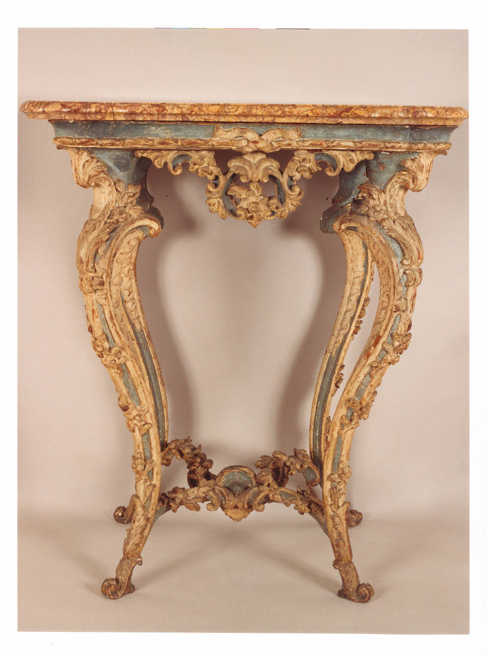 Elegante console con piano in marmo broccatello di Spagna; quattro sostegni ricurvi, motivo decorativo a ricciolo, conchiglia centrale sotto il piano e raccordo a tema vegetale.