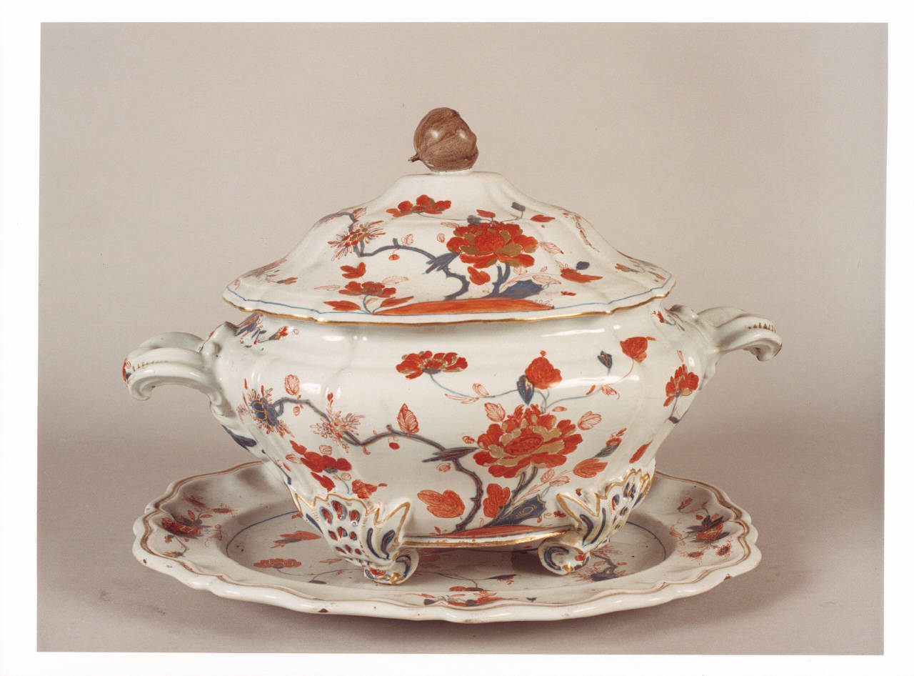 Zuppiera con decoro "Imari", leggermente rigonfia e costolata, poggiante su quattro piedini a ricciolo come nei due manici. Coperchio a pagoda con pomolo a forma di melograno.\nSi ha un raffinato decoro naturalistico con rami fioriti in cui spiccano i rossi garofani. La gamma cromatica utilizzata è ripresa dalla porcellana giapponese, con blu sottosmalto, mentre il rosso e l'oro sono sopra smalto, secondo una tecnica decorativa tipica del Rubati.