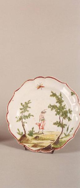 Piatto in maiolica dipinta, mistilineo, con decoro di figura femminile e un piccolo uccello posto sopra un piatto.