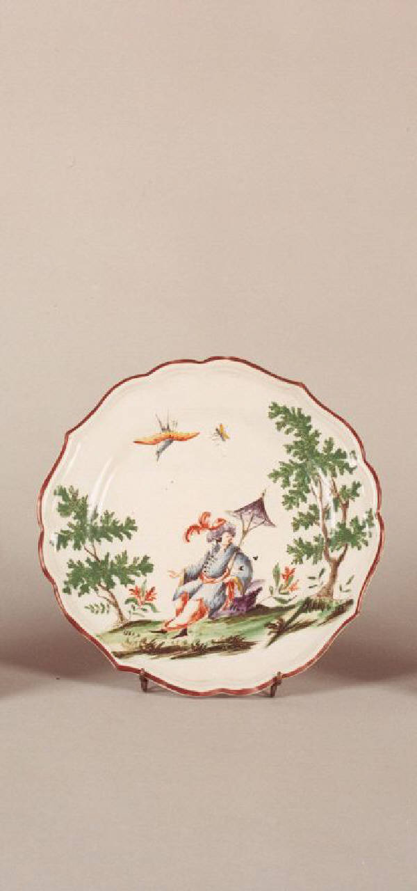 Piatto sagomato in maiolica dipinta, decorato con figura maschile che sorregge un piccolo parasole.