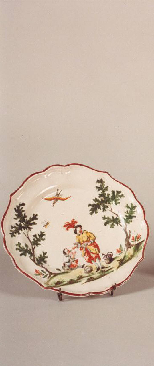Piatto in maiolica dipinta, mistilineo; decorazione a "paesaggino" con figura di bambino e di un uomo che lo imbocca, quest'ultimo probabilmente un "servitore chinese" come connotato dagli abiti, anche se le fattezze lasciano qualche perplessità.