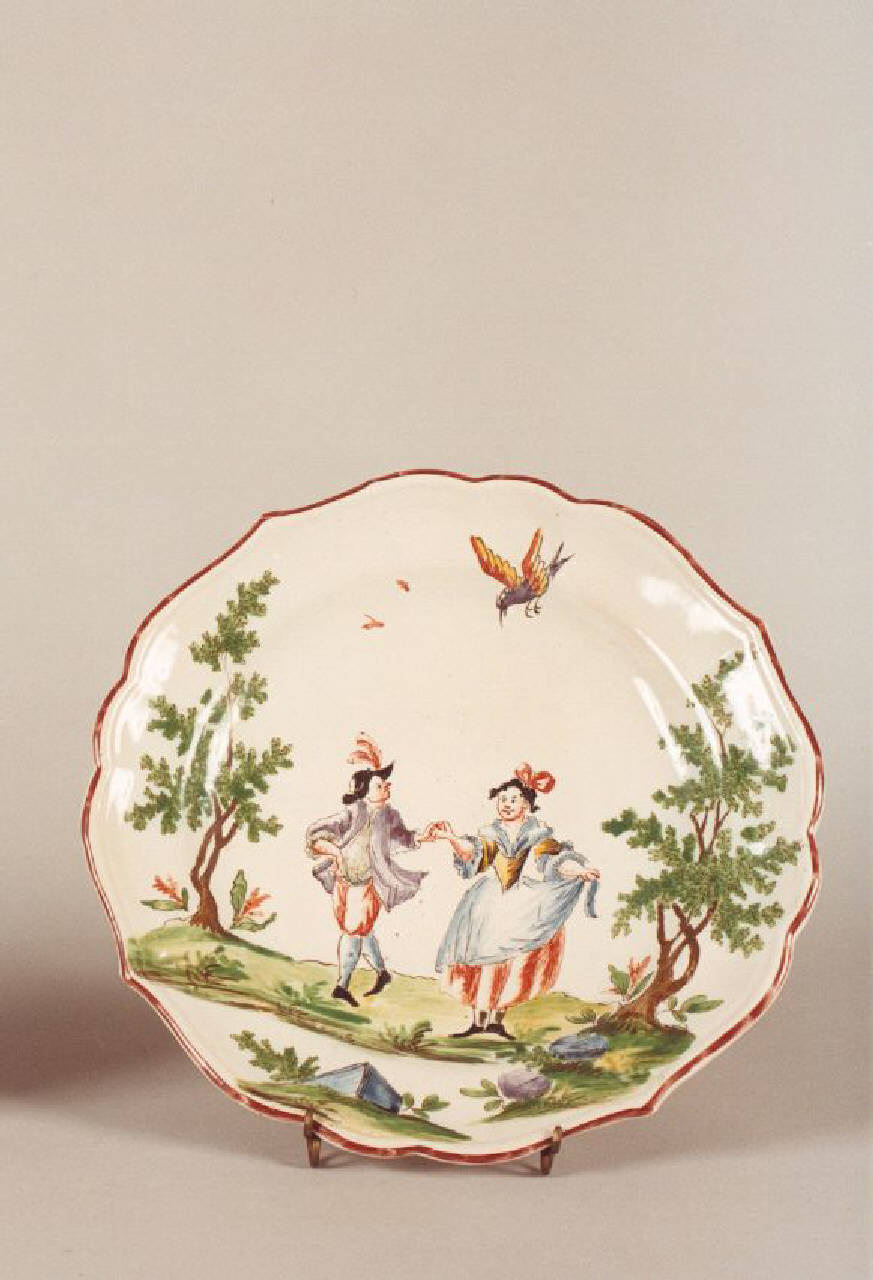 Piatto in maiolica dipinta, mistilineo, decorato con figura maschile e figura femminile che danzano.