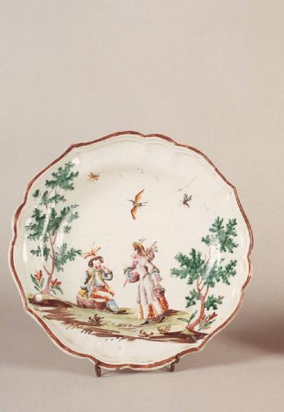 Piatto in maiolica dipinta, mistilineo, decorato con figura maschile e figura femminile che sorreggono dei cesti.