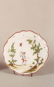 Piatto in maiolica dipinta, mistilineo, decorato con figura maschile e un farafalla.