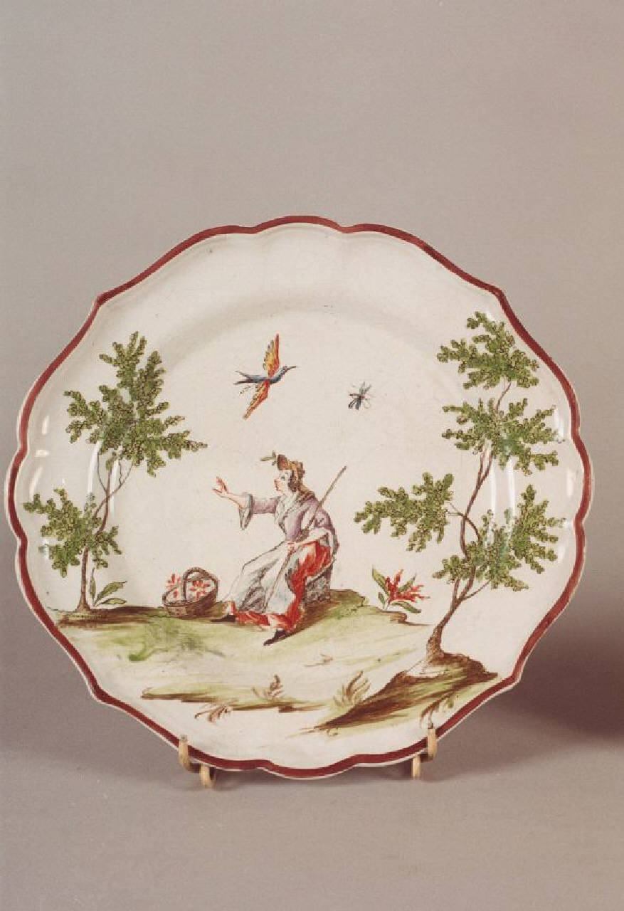 Piattino sagomato con bordo dipinto con figura femminile con un cestino.