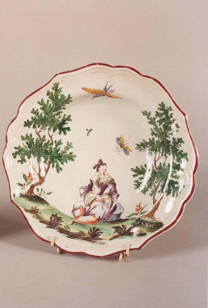 Piatto fondo sagomato con bordo dipinto con figura femminile e farfalle.
