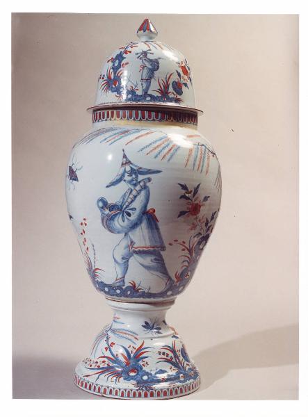 Grande vaso liscio, panciuto nella parte superiore, rastremato alla base poggiante su basamento a campana. Coperchio con pomolo.\nLa forma di questo vaso è prettamente orientale, mentre quella della base è europea, decorata con una bacellatura rossa profilata in blu e con rocce dalle quali partono foglie e fiori. La figura dipinta si erge su una roccia che si prolunga anche nell'altro lato del vaso, concludendosi con i rami incrociati di un salice piangente. Si completa con degli insetti svolazzanti ed un trampoliere. Sull'orlo del vaso si trova ripetuta la bacellatura della base, mentre nel coperchio vi sono gli stessi motivi decorativi più in piccolo.
