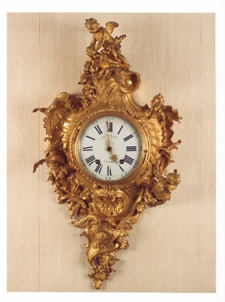 Orologio cartel in bronzo dorato e cesellato con putti e draghi.