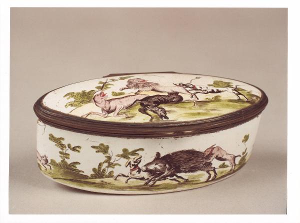 La tabacchiera, in porcellana dipinta e di forma ovale, ha un coperchio incernierato. Presenta una decorazione raffigurante scene di caccia, che si ripetono anche all'interno del coperchio. Opera di una manifattura tedesca, è databile alla seconda metà del XVIII secolo.