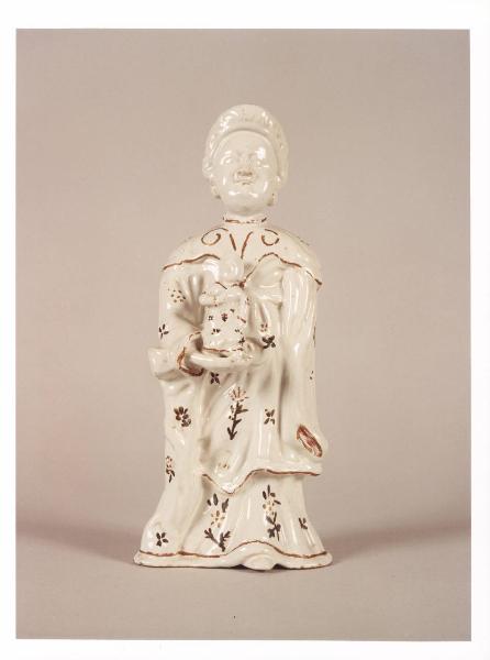 - NOTIZIE STORICO CRITICHE Felice Clerici aprì la propria manifattura per la produzione di maiolica nel 1745, nella zona di San Vittore di proprietà dell'Ospedale Maggiore di Milano, di cui era amministratore. Le sue maioliche, con cotture a piccolo fuoco, tendevano a gareggiare con quelle lodigiane contemporanee. I motivi decorativi si ispirano dapprima alla decorazione floreale di tipo lodigiano, in seguito, secondo la moda imperante delle cineserie, interpretando con un gusto garbato e ironico tutto milanese, modelli orientali cinesi di epoca Ch'ing e porcellane Imari giapponesi, oppure i tipici "paesini e figure a smalto" con scene popolate da personaggi ripresi dal teatro e dalla vita popolare e cittadina del tempo. Nel 1789 la fabbrica chiude per fallimento. La piccola scultura in oggetto potrebbe appartenere alla manifattura Clerici, per confronto con altre opere a soggetto analogo. Queste figure erano modellate a stampo, ad imitazione dei celebri pezzi in porcellana prodotti in Cina dal XVII secolo e chiamati "Blanc de chine", in più decorate con fondi colorati e motivi floreali dipinti a "freddo".\nIl manufatto in precedenza si trovava nel piano seminterrato di Villa Necchi.