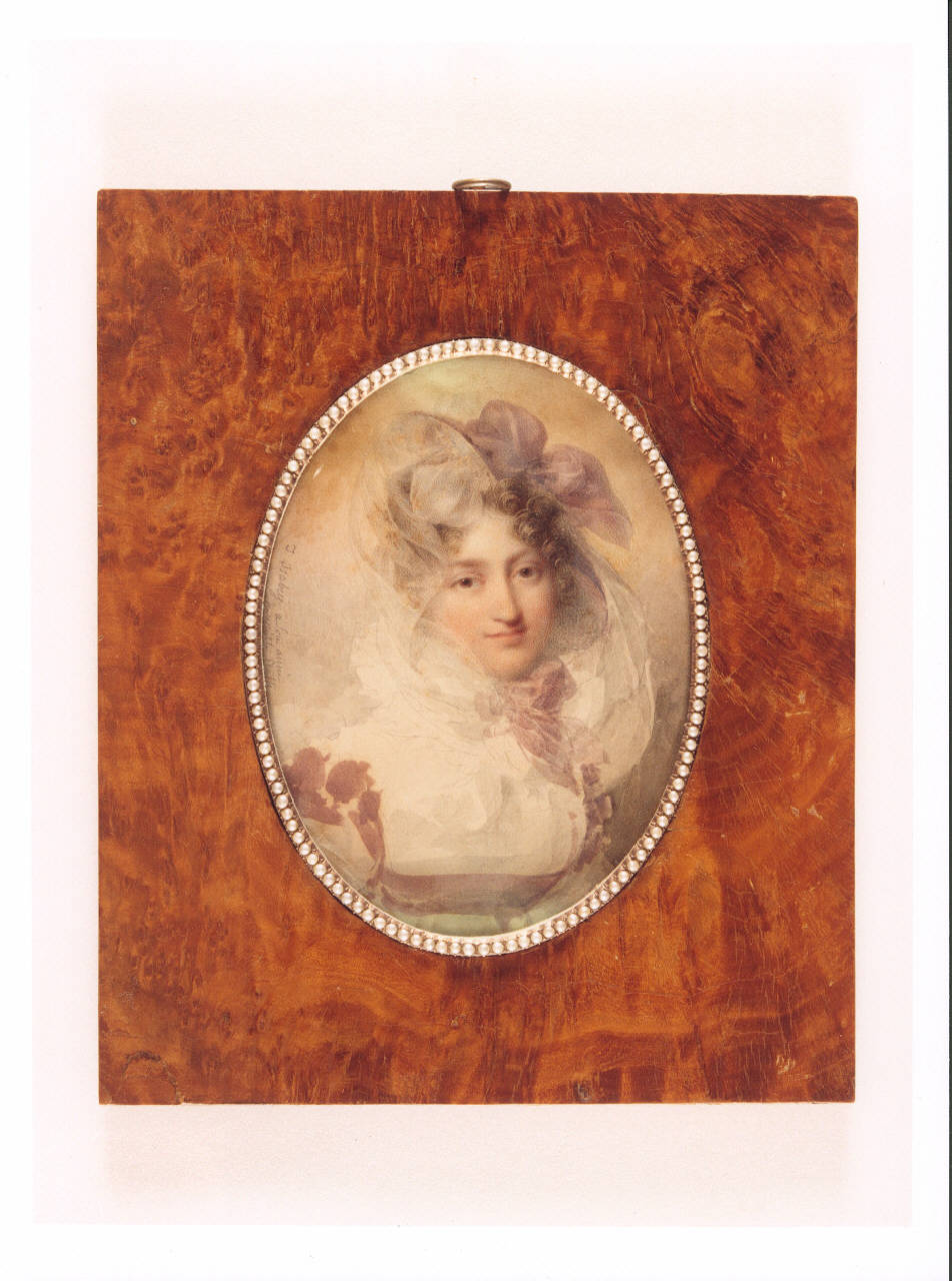 Acquerello su carta raffigurante una dama in abiti bianchi e viola, inserito in un ovale perlinato in bronzo dorato; cornice rettangolare esterna in radica. Miniatura di Jean-Baptiste Isabey (1767-1855), 1814 circa; opera firmata.