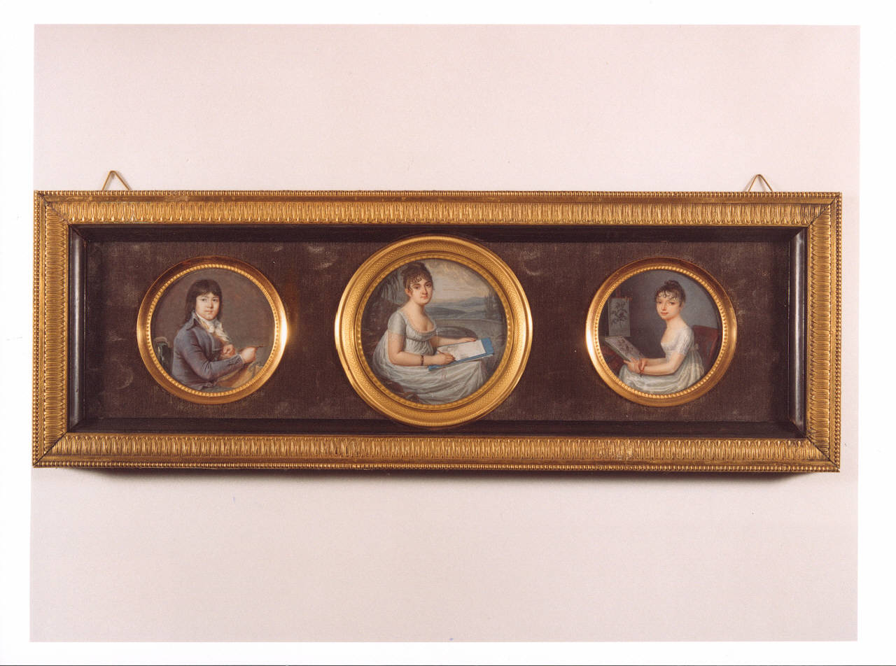 Serie costituita da tre miniature, inserite in una sola cornice in bronzo dorato con perlinatura, dotata di un passe-partout in velluto nero. Gli acquerelli su carta raffigurano giovani artisti. Miniature di Jean-Baptiste Isabey (1767-1855), databili tra 1799 e 1810. La giovane donna al centro potrebbe essere la moglie del pittore, Jeanne-Laurice de Salienne (morta nel 1829).
