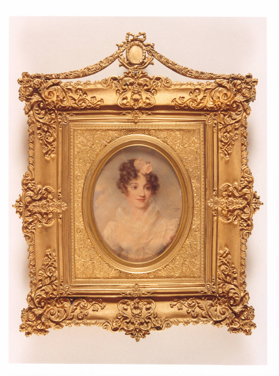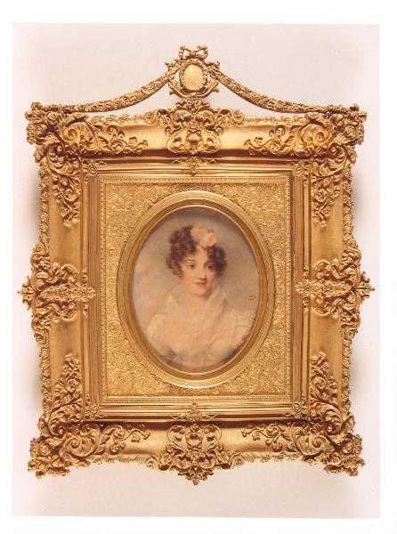 Acquerello su carta raffigurante una giovane donna con un abito bianco e fiori rosa tra i capelli, inserito in una cornice in bronzo dorato con fregi. Miniatura di Jean-Baptiste Isabey (1767-1855), 1822; opera firmata e datata.