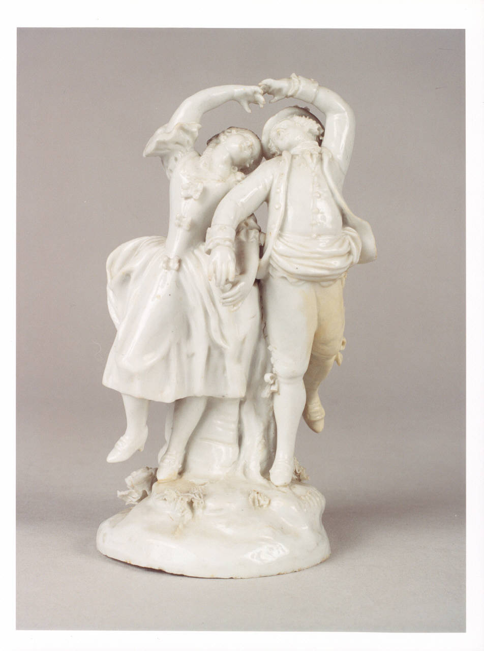 Gruppo scultoreo raffigurante un giovane uomo e una donna mentre ballano; le mani intrecciate sia in basso che in alto; la gestualità sottolineata dalle pieghe sinuose degli abiti. Basamento circolare con decoro floreale e pianta retrostante.