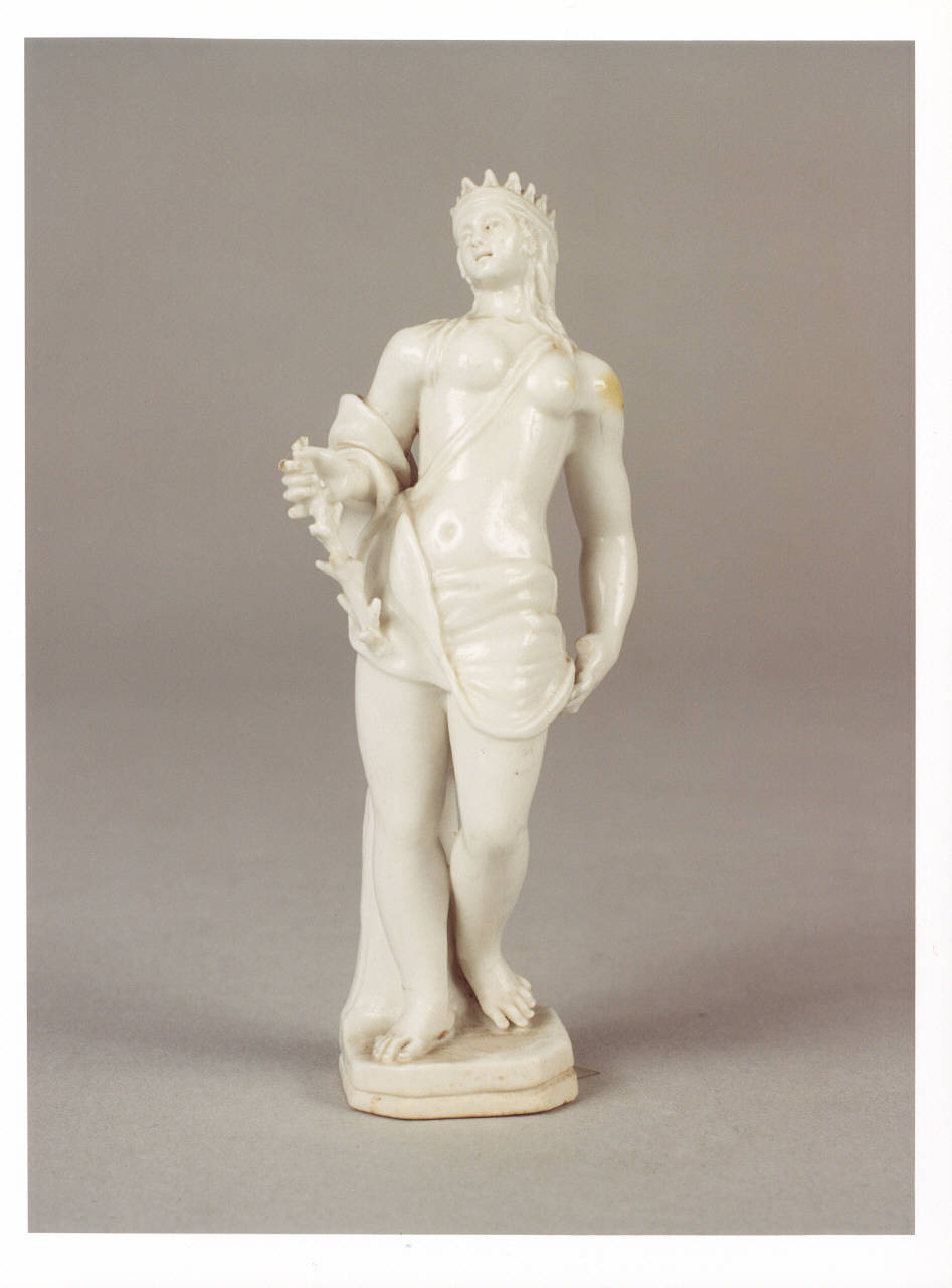 - NOTIZIE STORICO CRITICHE A Este tre fabbriche si dedicarono alla porcellana, tra cui quella di G. B. Brunello, formatosi all'interno della Manifattura Le Nove. La produzione si spinse fino ai primi dell'Ottocento. La porcellana prodotta si caratterizza per la lucidità e per forme originali, come la piccola scultura che raffigura una giovane donna con corona sul capo, lunghi capelli, semplicemente ricoperta da un panneggio. Iconograficamente non è facilmente identificabile; si potrebbe ipotizzare che sia Diana, la Dea vergine per eccellenza, a cui la nudità farebbe riferimento.\nLa statuetta in precedenza si trovava nel piano seminterrato.