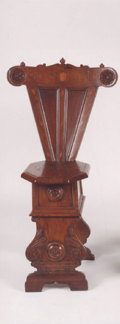 Sgabello dotato di schienale con motivi decorativi intagliati a volute nel sostegno, a fiore nella spalliera raccordati da un intarsio a girali con stemma privo di insegne araldiche nella parte centrale. La seduta ottagonale poggia su un plinto modanato sostenuto da due montanti ad "asso di coppe", uniti da una traversa.