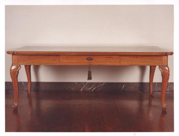 Tavolo in legno di noce chiaro ad un cassetto, piano sagomato e gambe cabriolet.