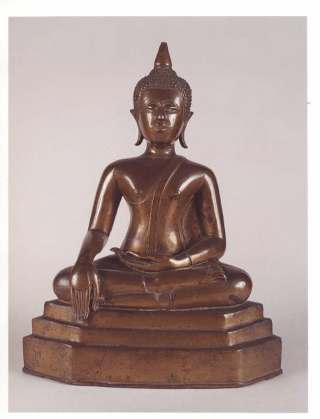 Statua in bronzo dorato su base piramidale terminante in fiore di loto.