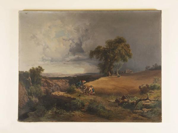 - NOTIZIE STORICO CRITICHE L'opera, già nella collezione delle sorelle Gigina e Nedda Necchi, entra a far parte del patrimonio FAI nel 2001, in quanto parte del lascito di Villa Necchi Campiglio a Milano. Il dipinto rappresenta un paesaggio poco prima dell'arrivo della tempesta, come suggeriscono diversi elementi raffigurati: le nubi scure sulla destra, gli abiti smossi dal vento, le spighe di grano piegate e persino il cappello che vola via dalle mani del giovane ragazzo. L'opera, firmata e datata, è stata eseguita da Andrea Markò, pittore paesaggista di origine austriaca, figlio del pittore Carlo Markò, da cui il giovane ereditò la predilezione per grandi quadri con soggetti campestri. La pittura di paesaggio ripresa dal vivo fu il soggetto privilegiato dall'artista che a partire dagli anni Cinquanta dell'Ottocento fece parte della Scuola di Staggia, appellativo dato a un gruppo di pittori che dipingevano le colline senesi direttamente "en plein air".