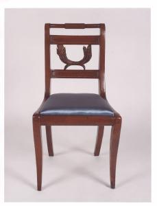 - NOTIZIE STORICO CRITICHE Sedie Impero caratterizzate da una forma piuttosto squadrata con ornamentazione centrale costituita da due cornucopie in legno intagliato e dorato ad emulazione della fusione del bronzo. Il motivo decorativo dello schienale è ripreso dalla Roma imperiale.\nLe sedie in precedenza si trovavano al piano terra, Studio, parete verso il corridoio.