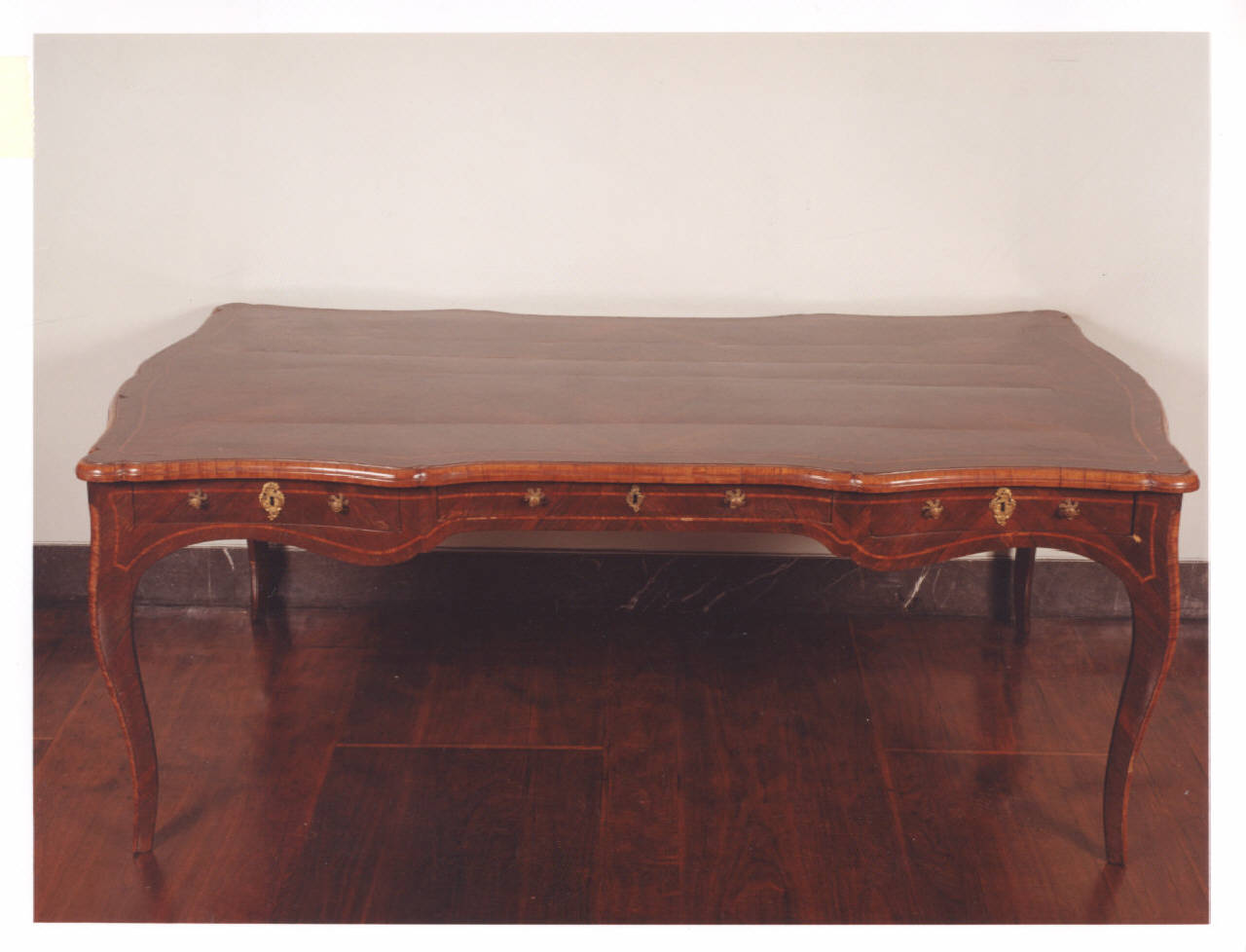 Scrivania da centro di forma mossa impiallacciata in bois de rose, intarsi in mogano viola; cassetto centrale e due ai lati, montature in bronzo.