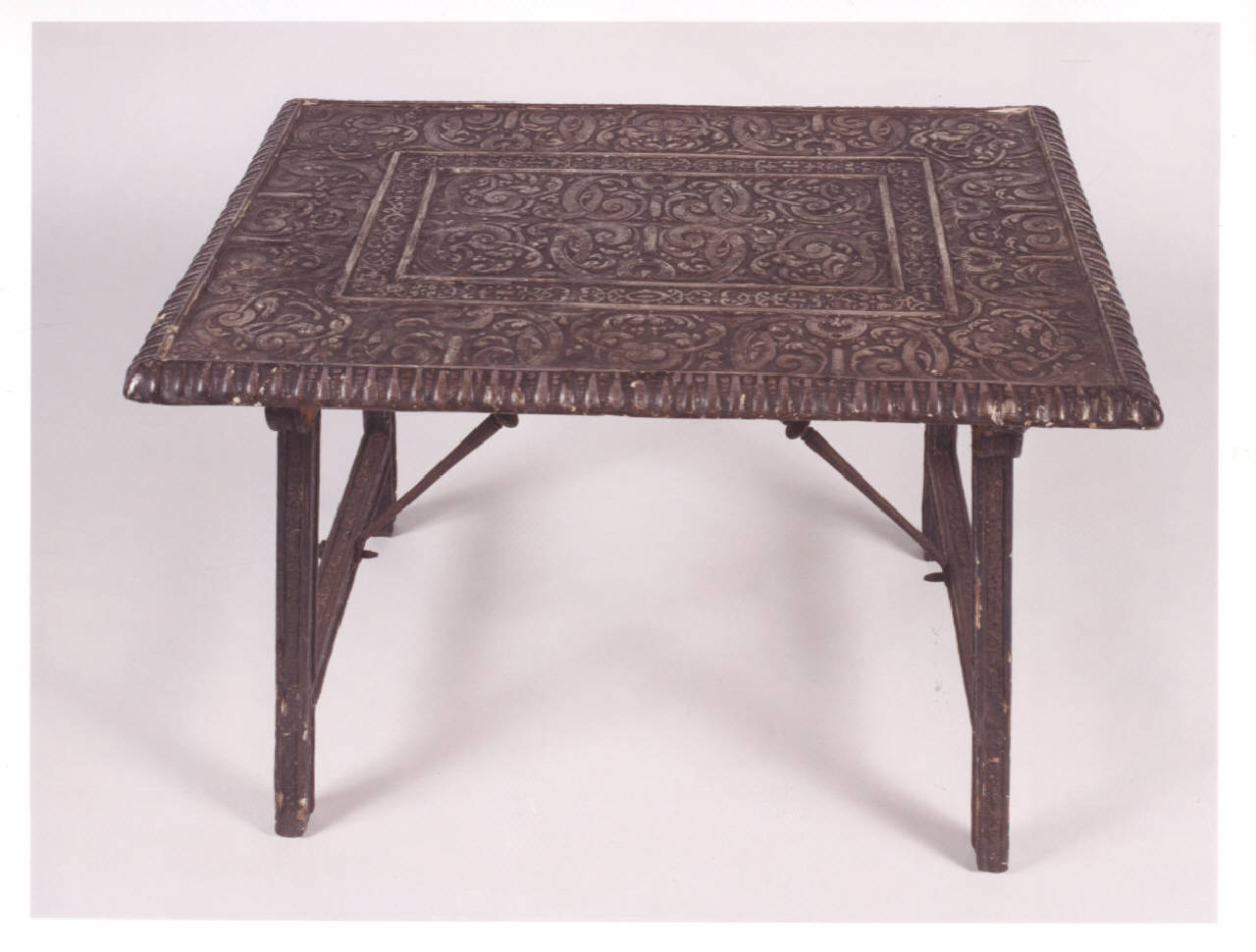 Tavolino da viaggio con sostegni diritti uniti da traverse; aggancio mobile al piano in ferro battuto. Piano con bordura a ovuli allungati e decoro con arabeschi a foglia d'acanto intrecciate.
